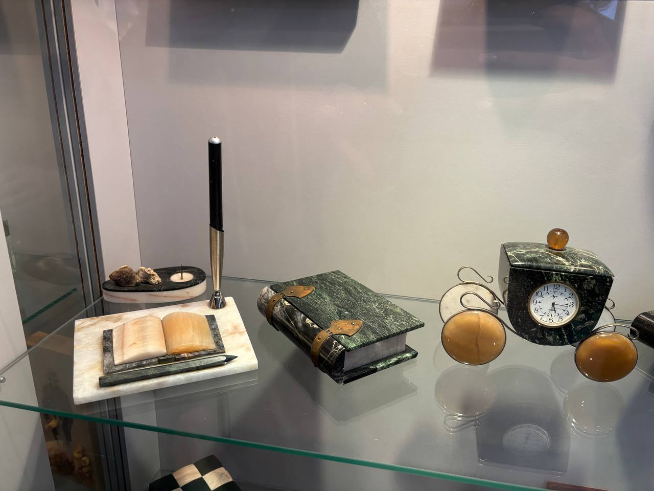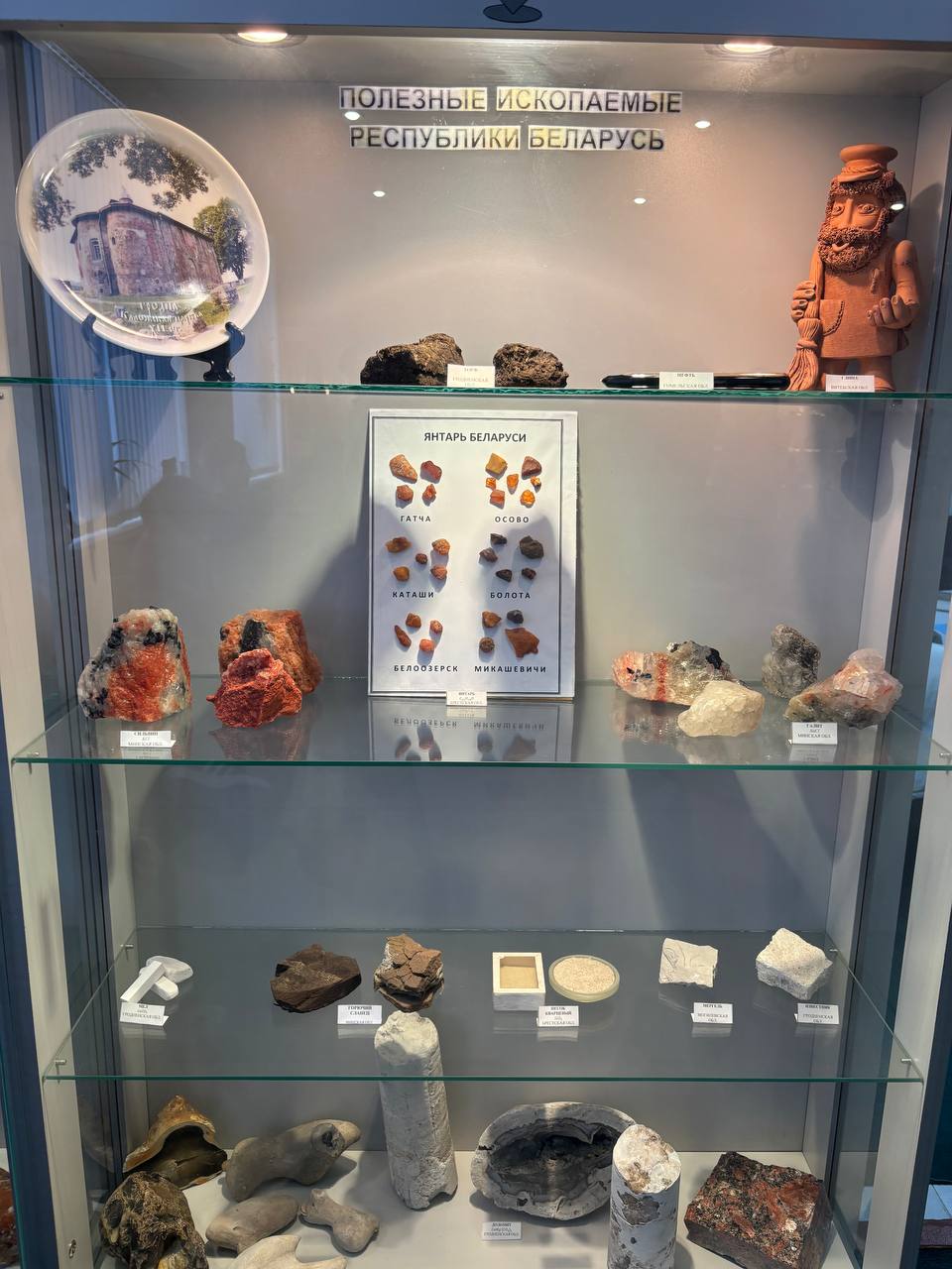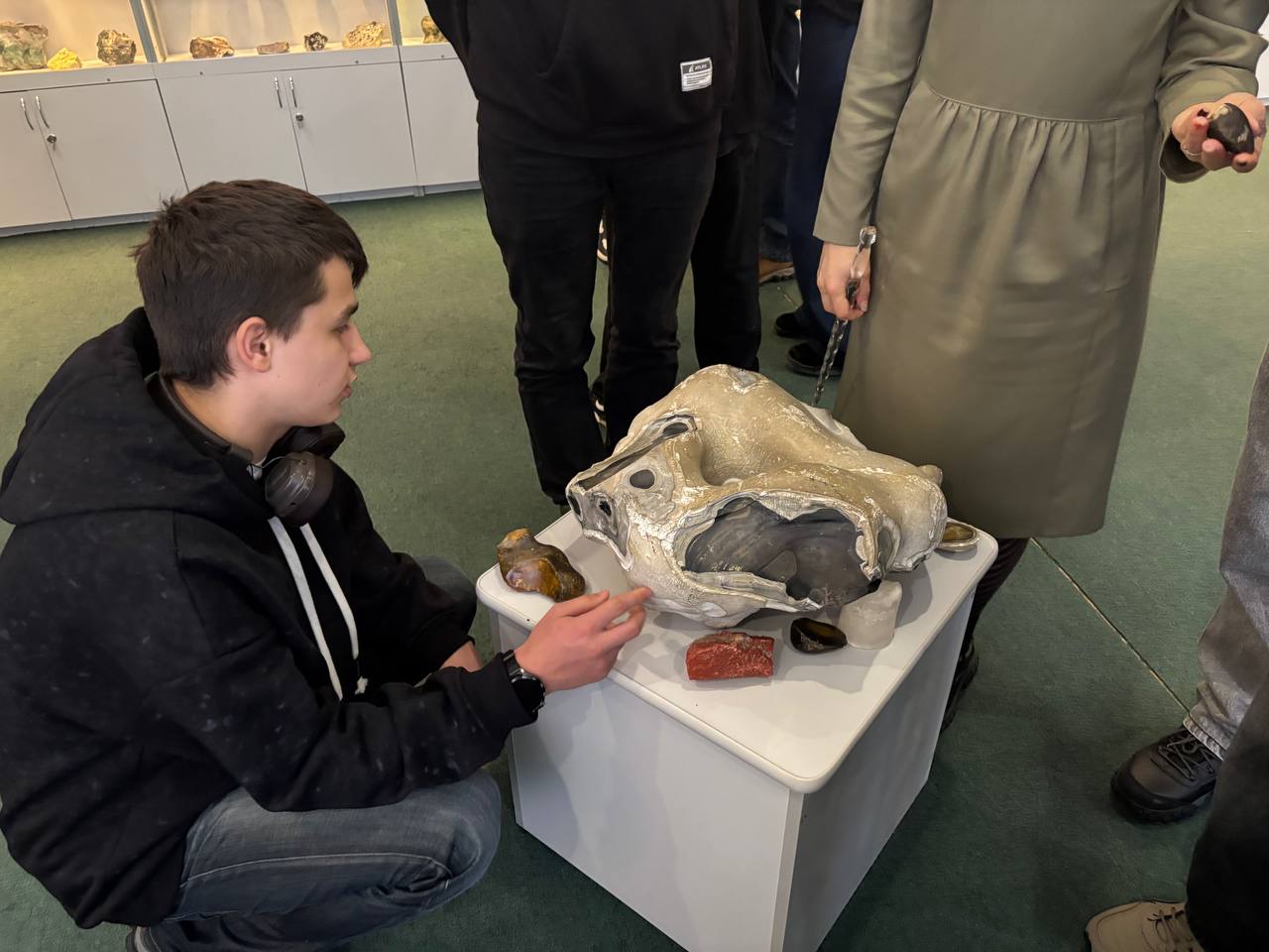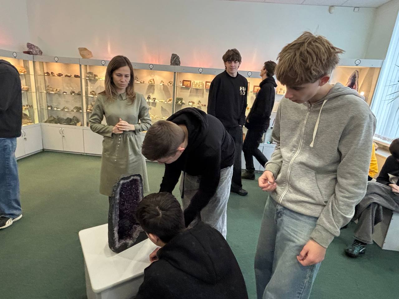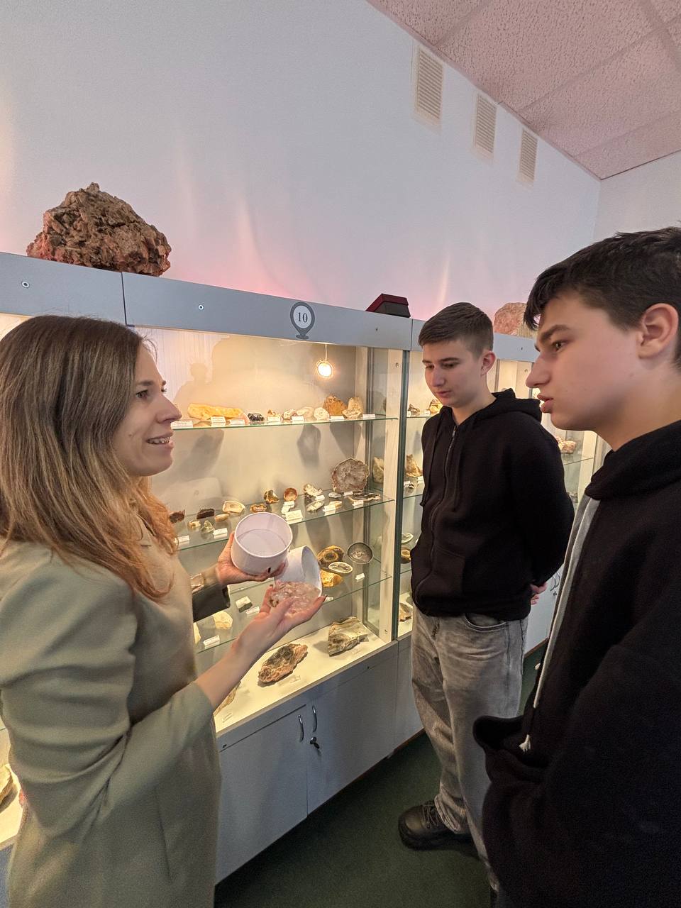 Особое внимание привлекли ценные экспонаты музея – три жеоды бразильских аметистов, переданные в дар музею распоряжением Департамента по гуманитарной деятельности управления делами президента Республики Беларусь, панно с двумя спилами раковины аммонита в наборной основе, состоящей из оникса кальцитового (Таджикистан), уваровит (Северный Урал), лазурит (Забайкалье), десмин (Средний Урал), чароит (Якутия).