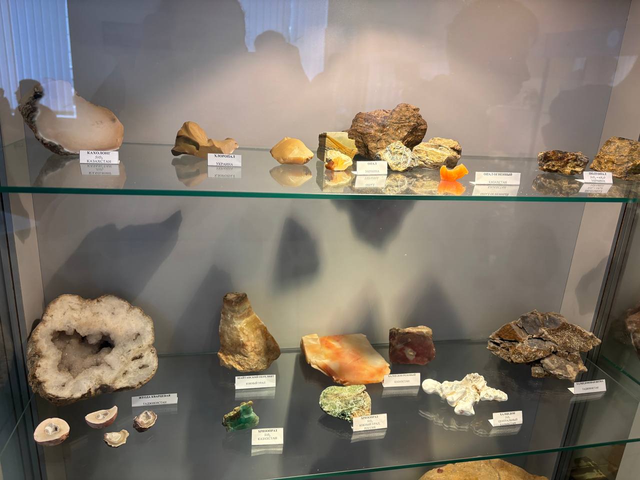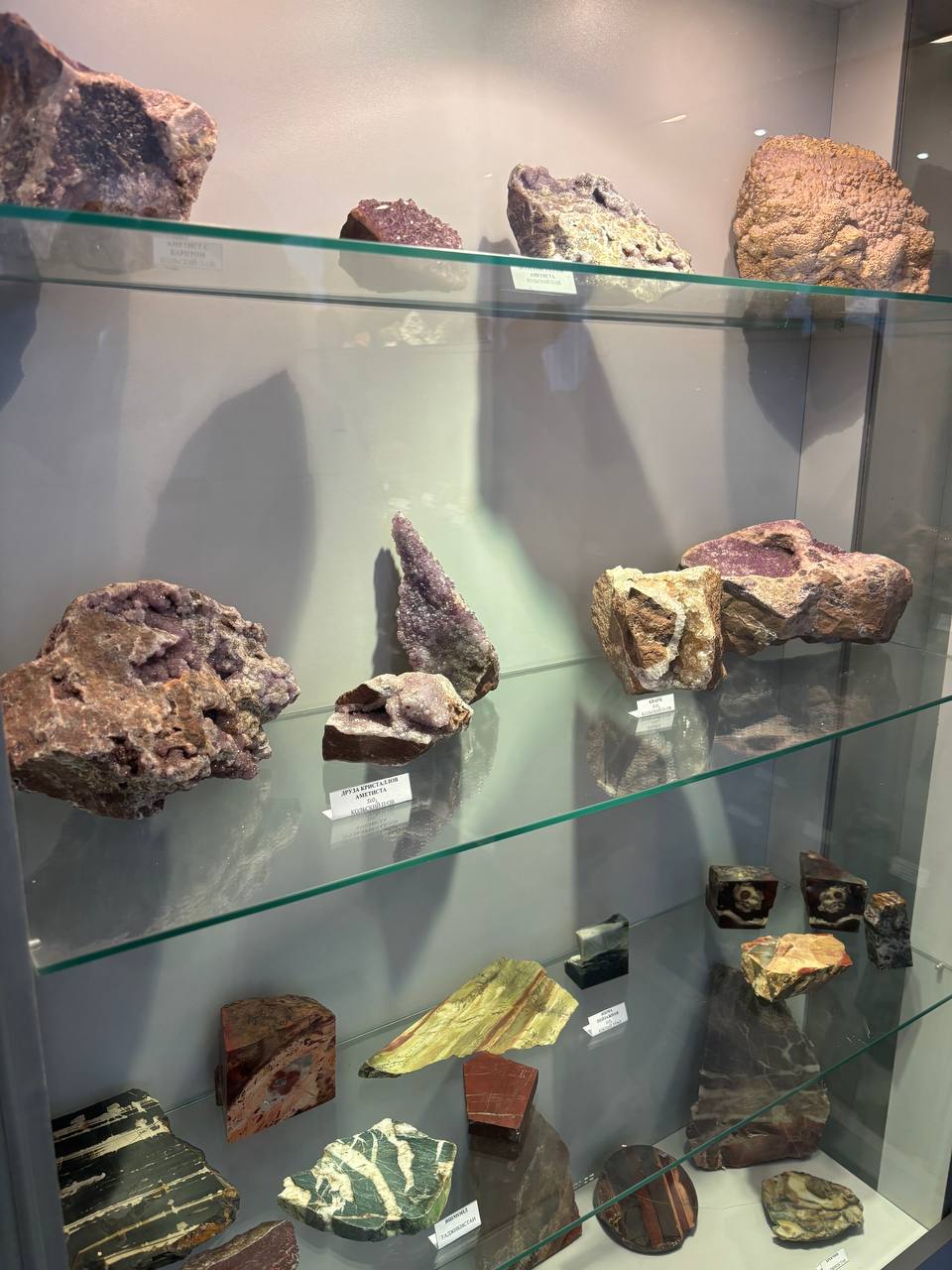 В 20 витринах представлены следующие разделы: породообразующие, металлические, неметаллические, цветные, декоративные минералы и горные породы, камнерезные изделия, созданные учащимися.