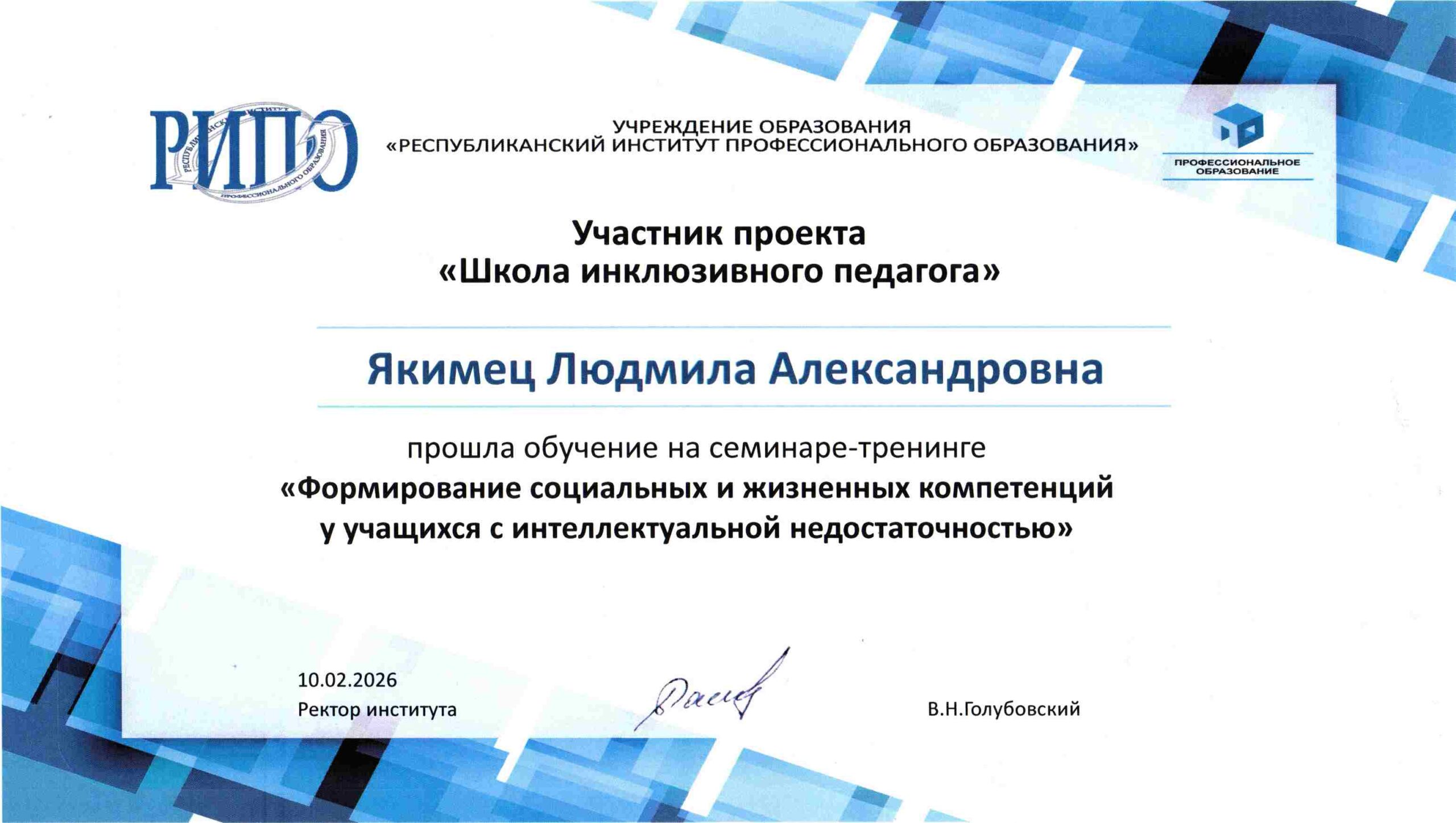 10 февраля Якимец Людмила Александровна, заведующий отделением общестроительных специальностей приняла активное участие в республиканском семинаре-тренинге «Формирование социальных и жизненных компетенций у учащихся с интеллектуальной недостаточностью», который состоялся на базе учреждения образования «Республиканский институт профессионального образования».